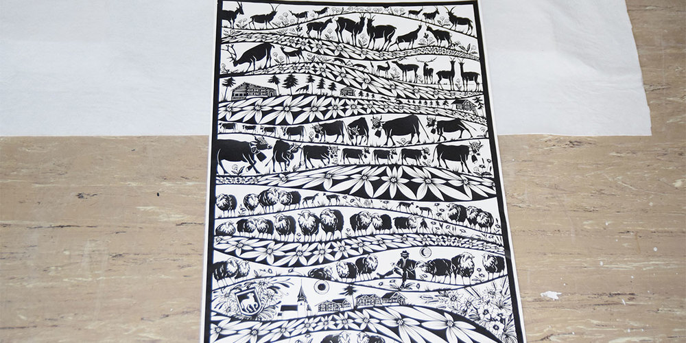 Ihre Scherenschnitte nennt die Künstlerin lieber Papierschnitte, denn sie arbeite seit jeher nur mit dem Messer. Als Kind habe ihr diese Art von Darstellung (schwarz/weiss) gar nichts gesagt. «Meine Mutter hatte damals ein Märchenbuch mit Scherenschnitten drin. Weil es ihr so gut gefiel, wollte sie es auch uns Kindern schmackhaft machen. Ich fand es eher öde.» Trotz diesem anfänglichen Zögern kam ich später doch noch auf den Geschmack und auch hier hatte die Mutter die Finger im Spiel. «Sie leitete damals als Mitinitiantin die Werkstube in Klosters, bei der Kurse angeboten wurden. Wenn dann wieder mal jemand ausgefallen ist, fungierte ich als Lückenbüsserin. So habe ich neben den Papierschnitten auch viel gemalt, mit Batik hantiert oder auch Porzellan bearbeitet.» 1996 kam der Punkt an dem Monika Flütsch das Schneiden von Papier in die engere Auswahl nahm. «Meine damalige Kursleiterin Susanne Schläpfer ermutigte mich an der Scherenschnittausstellung teilzunehmen, was ich dann auch tat. Die Kritiken der Juroren waren jedoch ziemlich vernichtend. Während die meisten Einsendungen klassische Motive zeigten, habe ich flippige Kühe mit Strapsen geschnitten. Damals wurde noch penibel darauf geachtet, dass der ganze Schnitt an einem Stück daherkommt, nicht auseinanderfällt und einer gewissen Tradition folgt.» Das Bild mit den drei musizierenden Kühen, das sie damals einreichte, wurde als Comic abgetan. Doch wegen dieser Kritik habe sie ihren Kopf nicht hängen lassen, denn anders als die Juroren fanden sich bei der Ausstellung immer viele Menschen vor ihren Werken, denen ihr Stil sehr zugesagt haben muss.