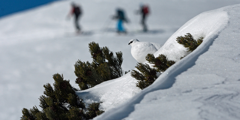 Unser Wunsch nach Einsamkeit kann aber schwerwiegende Konsequenzen für die Tierwelt haben, die bereits mit den schwierigen Bedingungen des Winters zu kämpfen hat: In der kalten Jahreszeit gibt es kaum Nahrung, und es stehen nur wenige helle Stunden für deren Suche zur Verfügung. Das Aufrechterhalten der Körpertemperatur benötigt zudem viel Energie. Kräfte zu sparen ist deshalb eine Frage von Leben und Tod für Bergvögel wie Birkhuhn, Auerhuhn und Alpenschneehuhn, die auch zu den Prioritätsarten für die Artenförderung gehören.