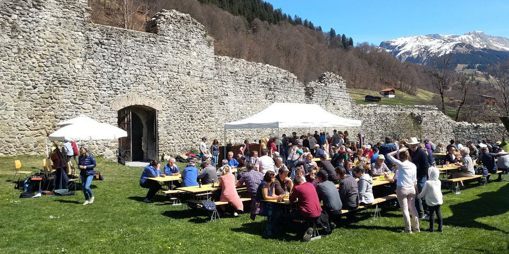 Strahlendes Wetter und sommerliche Temperaturen innerhalb der Mauern der Burgruine lockten zahlreiche Gäste zum diesjährigen Osterfest nach Putz. Man konnte sichtlich spüren, dass es ein grosses Bedürfnis ist, sich wieder zu treffen und sich auszutauschen. Während die Erwachsenen sich unterhielten, konnten sich die Kinder im Schlosshof austoben und schon fast vergessene Spiele wiederentdecken. «Büchsenwerfen», «Needli leggen» und «Sackhüpfen» machen anscheinend immer noch genau so viel Spass, wie zu Zeiten vor den Computerspielen. Auch das Ponyreiten erfreute sich grosser Beliebtheit. Speis und Trank und bodenständige musikalische Unterhaltung rundeten diesen gelungenen Anlass ab.