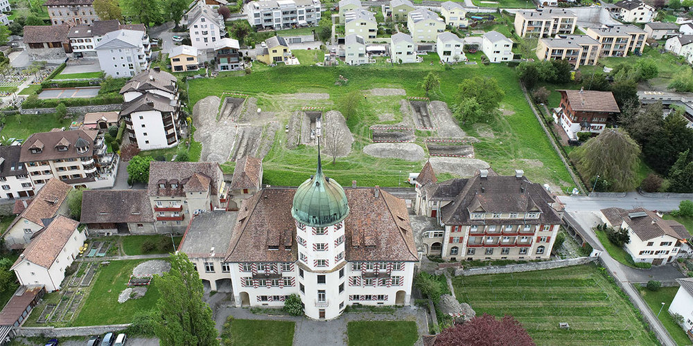 Der Schlossbungert diente früher dem Obstbau. Anlässlich der geplanten Überbauung unternahm der Archäologische Dienst bereits im Mai 2021 geophysikalische und archäologische Prospektionen. Dabei zeigten sich im nördlichen Teil des von Rüfen geprägten Areals einerseits Siedlungsreste, andererseits Grabfunde. Infolgedessen wurde in Abstimmung mit den Bauverantwortlichen eine grossflächige Ausgrabung geplant, die seit Anfang dieses Jahres im Vorfeld des eigentlichen Neubaus durchgeführt wird. Die archäologischen Befunde datieren hauptsächlich in die spätrömische Zeit (ca. 250 – 450 n. Chr.) und wohl noch ins frühe Mittelalter.