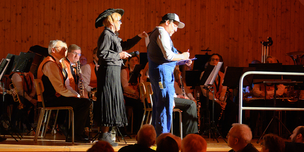 Ja, die alte Halle wüsste viel zu erzählen. Doch wie gibt man ihr eine Stimme? Theaterverein Grüsch fragen. Dieser ist sofort und gerne zur Stelle und Annagreth Wiedmer, alias «alte bzw. neue Halle» und Marco Ballat, alias «Hausabwart» übernehmen die Moderation. Auf sehr beschwingliche, unterhaltsame Art und Weise führen sie theatralisch durch den Abend. Eine sehr gelungene Ergänzung zu den musikalischen Darbietungen der Musikgesellschaft (MG) Grüsch.