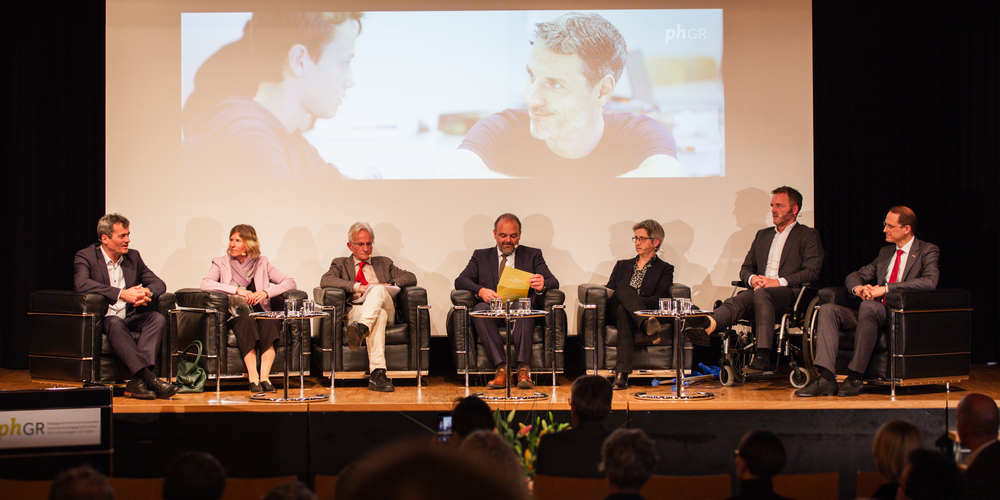 Im Rahmen eines Inputreferat konnte Prof. Dr. Maag Merki, Direktorin des Instituts für Erziehungswissenschaften an der Universität Zürich, gestützt auf verschiedene Studien entlang eines ersten Zugangs aufzeigen, dass der familiäre Bildungshintergrund mit dem Erreichen der Grundkompetenzen zusammenhängt. So schneiden Kantone mit einer geringeren Bildungsbenachteiligung bei der Erreichung der Grundkompetenzen besser ab, als Kantone, die einen stärkeren Einfluss der familiären Herkunft auf die Leistung der Schülerinnen und Schüler aufweisen. Dieser Trend zeigt sich nicht nur bei der Überprüfung der Grundkompetenzen (ÜGK), sondern auch in den aktuellen Resultaten der PISA-Studie. Während sich die Leistungen der Schülerinnen und Schülern aus Familien mit einem bildungsnahen Hintergrund konstant hoch zeigen, sind die Leistungen von Schülerinnen und Schüler aus Familien mit einem eher bildungsfernen Hintergrund in den letzten sieben Jahren deutlich rückläufig. «Wir verlieren die Schülerinnen und Schüler aus Familien mit einem bildungsfernen Hintergrund», so Katharina Maag Merki. Dieser Herkunftseffekt führt sie zum zweiten Zugang, nämlich zur Selektion in der Primarschule. Maag Merki konnte aufgrund der Resultate im Fach Mathematik aufzeigen, dass die Verteilung der ÜGK-Mathematikleistungen nach Schultyp hohe Überlappungen aufweist. So sind die Mathematikkompetenzen der besten Realschülerinnen und -schüler auf demselben Niveau wie jene der schwächsten Gymnasiastinnen und Gymnasiasten. Um solche «Fehleinteilungen» zu vermeiden, schlägt die Professorin vor, die Selektion erst in der neunten Klasse (3. Oberstufe) vorzunehmen und konsequenterweise bis dahin auf Noten zu verzichten. An der anschliessenden Podiumsdiskussion mit Marc Bourgeois (Mitglied des Kantonsrats sowie der Kommission für Bildung und Kultur im Kanton Zürich), Renato Fasciati (Direktor Rhätische Bahn), Franz Eberle (emeritierter Professor für Gymnasial- und Wirtschaftspädagogik an der Uni Zürich), Katharina Maag Merki (Direktorin des Instituts für Erziehungswissenschaft, Universität Zürich), Sandra Locher Benguerel (Alt-Nationalrätin, Vize-Präsidentin des Hochschulrates der PH Graubünden, Geschäftsmitglied LCH, Lehrerin) sowie Rudolf Minsch (Stv. Vorsitzender der Geschäftsleitung economiesuisse, Leiter allgemeine Wirtschaftspolitik & Bildung / Chefökonom), unter der Leitung von Prof. Dr. Gian-Paolo Curcio (Rektor PHGR), wurden bestehende Bewertungspraktika, mögliche Lösungsansätze und künftige Entwicklungen angeregt und kontrovers diskutiert. Einig waren sich die Teilnehmenden des Podiums indessen, dass die Schule unter anderen eine Qualifikations- und Selektionsfunktion zu erfüllen hat. Es geht entsprechend nicht um die Frage ob, sondern wann die Selektion erfolgt und wie sie umgesetzt wird. Seitens der Wirtschaft wird gefordert, dass die Noten und Berichte vergleichbar sein müssen, wenn möglich sogar auf nationaler Ebene. Geleichzeitig forderte Prof. Dr. Rudolf Minsch die Stärkung der beruflichen Grundbildung (Berufslehre) und die Sicherung der Qualität an Gymnasien. «Das Gymnasium ist nicht in jedem Fall der Königsweg», so Rudolf Minsch. Dem Bündner Aufnahmeverfahren ans Gymnasium stellt Prof. Dr. Franz Eberle ein gutes Zeugnis aus, zumal damit nicht nur die Tagesform einer Schülerin oder eines Schülers berücksichtigt wird, sondern die Vornoten einzelner Fächer berücksichtigt werden. Einem freien Zugang ans Gymnasium steht er indessen kritisch gegenüber, zumal dies das Problem der Selektion auf einen späteren Zeitpunkt verschieben würde. Sandra Locher Benguerel, Marc Bourgeois und Renato Fasciati betonten derweil, dass das Ziel der Volksschule unter anderem das Erwerben von grundlegenden Kenntnissen und Kompetenzen sei, welche es ihnen erlauben, lebenslang zu lernen und ihren Platz in der Gesellschaft sowie im Berufsleben, ihre Eignung und Neigung berücksichtigend, zu finden. Sandra Locher Benguerel unterstrich in diesem Zusammenhang: «Als Lehrpersonen ist es unsere Pflicht, unseren Schülerinnen und Schülern Erfolgserlebnisse vermitteln zu können, damit sie sich optimal weiterentwickeln können. Die sich verstärkende Bildungsungerechtigkeit ist ein Weckruf. Umso entschlossener müssen wir alles daransetzen, den jungen Menschen eine faire Entwicklungschance zu geben.» Selektion und Bildungsgerechtigkeit gehen uns alle an. Der Anlass «Mythos der gleichen Chancen. Schule, Selektion und Bildungsgerechtigkeit aus der Perspektive der Politik, der Wirtschaft und der Bildung» hat aufgezeigt, dass Selektion als Funktion der Schule und der damit verbundene Anspruch an eine hohe Bildungsgerechtigkeit angesichts der vorliegenden Erkenntnisse aus diversen Studien gesellschaftlich bedeutungsvoll und zugleich aktuell ist.