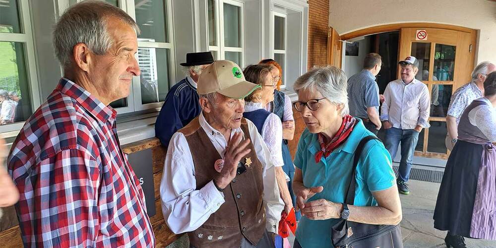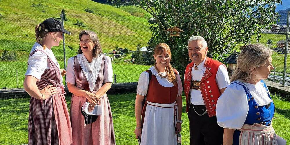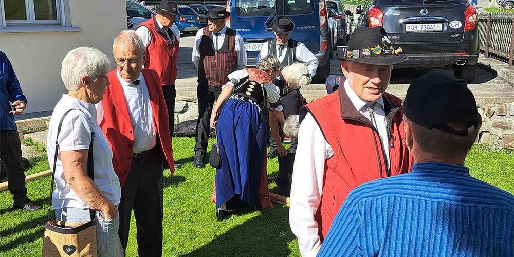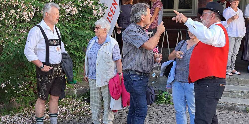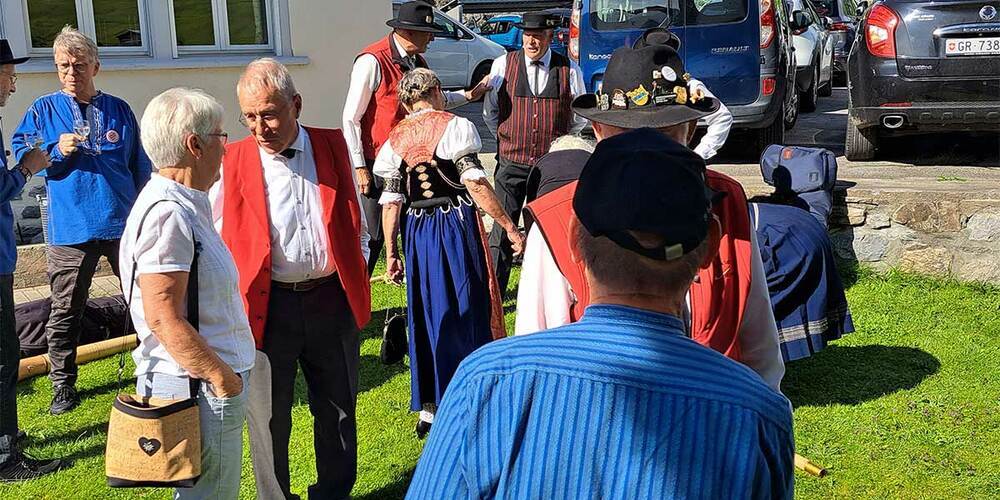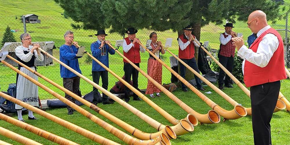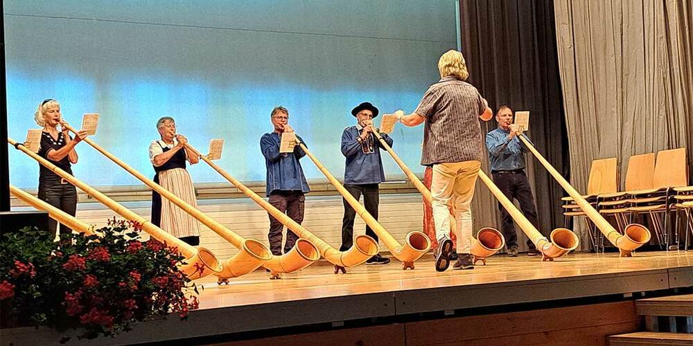 Bei strahlendem Sonnenschein empfing eine imposante Kulisse von siebzehn Alphornbläser:innen auf dem Vorplatz des Volksmusighus die zahlreich anwesenden Gäste und Zuhörenden.