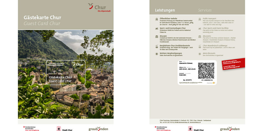 Chur hat eine Gästekarte! Der Zeitpunkt für die Lancierung könnte nicht besser sein. Seit dem 1. März erhalten die Gäste in den Churer Hotels die Gästekarte Chur. Es war ein langer Weg, doch nun präsentiert sich die Karte sehr gästeorientiert sowohl in Bezug auf die Leistungen wie auch auf die integrierten Vorzüge. Der Gast von heute erwartet im Bereich der Freizeitaktivitäten und Mobilität attraktive Angebote. Mit der neuen Gästekarte, die sowohl analog als auch digital funktioniert, wird Chur nun diesem Bedürfnis gerecht.