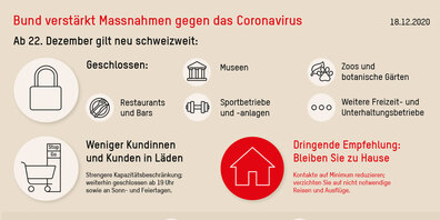 Hier können Sie die vom Bundesrat beschlossenen Massnahmen downloaden. Die neuen Massnahmen gelten ab dem 22. Dezember 2020 und sind bis zum 22. Januar 2021 befristet.