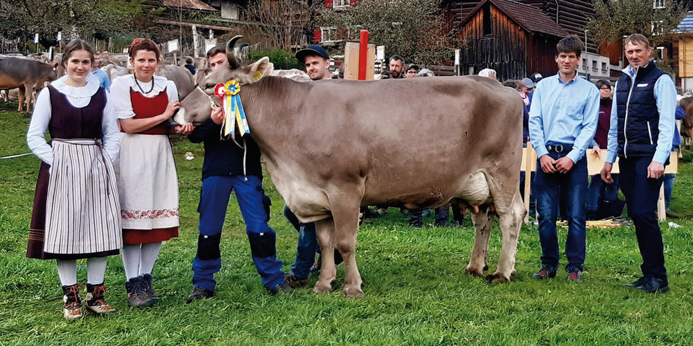 Weitere Top-Tiere bei den Frühbelegern und Erstmelkkühen der Rasse Brown Swiss präsentierten die Prättigauer Züchter. Bei den früh gekalbten siegt LIZZY von Hans Valär aus Jenaz, der mit BRAIDA auch die erste Abteilung Erstmelkkühe für sich entscheiden konnte. Der Publikums-Wettbewerb, bei dem sich die Zuschauer als Experten üben durften, lag der Klosterser Jöri Luzi am nächsten und gewann eine Weideschelle. Ebenfalls ein Geschick als Experte bewies der Safier Martin Zinsli, der eine weitere Weideschelle gewann. Sie setzten auf die Haegar-Tochter HIRTA von Georg Michel aus dem Lunden, die dann auch den Titel Jungkuh-Champion mit nach Hause nehmen konnte.