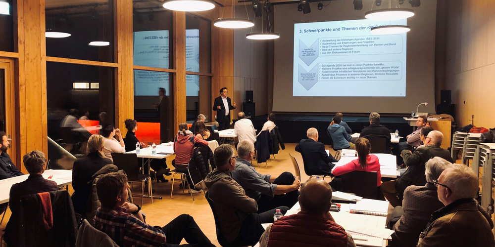 Für die Weiterentwicklung der 2015 von den Gemeinden beschlossenen regionalen Standortentwicklungsstrategie wurden Themen in den Schwerpunkten Tourismus, Wohnstandort, Forschung/Industrie/Gewerbe und Rahmenbedingungen zur Diskussion gestellt. Zum Beispiel sorgten die Zukunft des Tourismus vor dem Hintergrund des Klimawandels, die Bedeutung und Förderung des Wohnstandorts, die Notwendigkeit der Sensibilisierung für Entwicklungsprojekte oder auch der hohe Stellenwert der Querschnittsthemen Nachhaltigkeit und Digitalisierung für einen regen Austausch unter den Teilnehmenden.