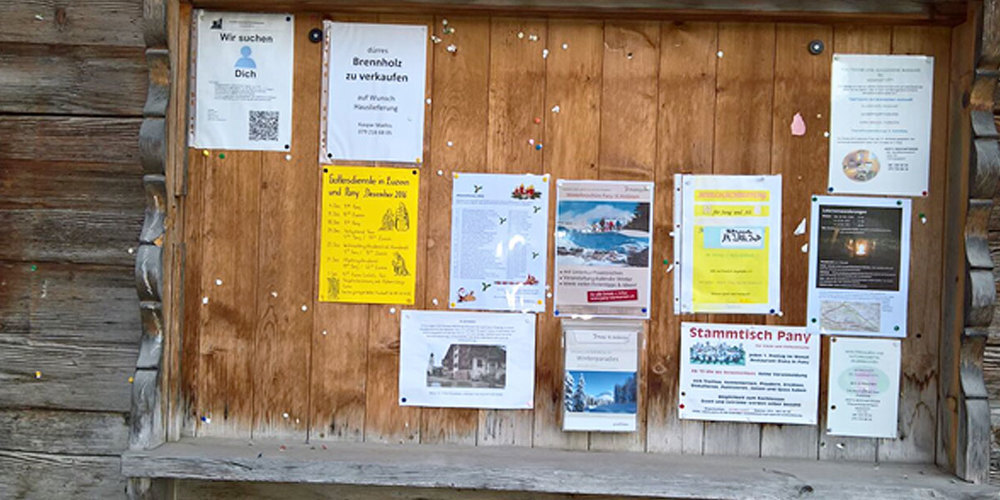 Vereine und zahlreiche Organisatoren von Veranstaltungen begrüssen den monatlichen Service von Kultur Prättigau. Nebst der Pflege der öffentlichen Plakatwände in den Prättigauer Gemeinden (Valzeina – Küblis) werden, wo erlaubt und vereinbart, auch die Hotel- und Gastrobetriebe sowie touristische Infostellen bedient. Inzwischen ist das Thema aktueller denn je. Eine Nutzung des Plakat- und Flyer-Verteilservice empfiehlt sich sehr, damit unnötige, individuelle Fahrten vermieden werden. Nebst der Pflege der Aushangstellen garantiert er auch eine saubere Präsentation der jeweiligen Veranstaltungen. Angeschlagen werden A4-Kleinplakate – grossformatige wie z. B. A3-Plakate und grössere dürfen nicht überall montiert werden. Der Verteilservice bringt das Gedruckte näher an die Zielpersonen.