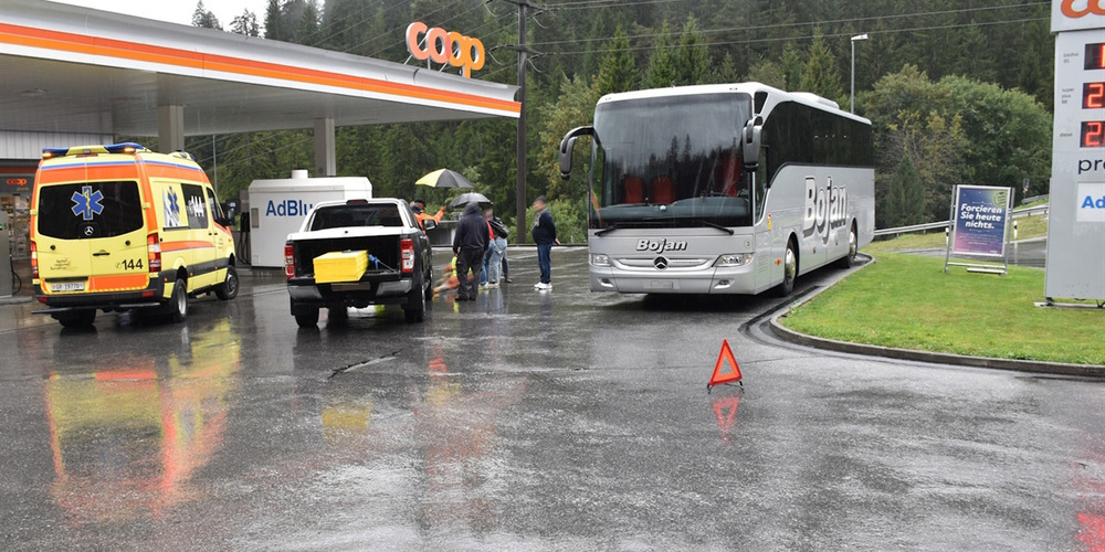 Die 63-jährige thailändische Touristin stieg kurz nach 10 Uhr auf einem Tankstellenareal aus einem Reisebus aus. Dabei wurde sie von einem in Richtung der Tanksäulen fahrenden Auto eines 54-Jährigen erfasst. Sie fiel zu Boden und zog sich dabei Kopfverletzungen zu. Ein zufällig an den Unfall herangefahrenes Team der Rettung Surselva versorgte die Frau medizinisch. Ein Team der Rettung Chur übernahm diese Versorgung und den Transport der Verletzten ins Spital nach Ilanz. Gemeinsam mit der Staatsanwaltschaft klärt die Kantonspolizei Graubünden den genauen Unfallhergang ab.