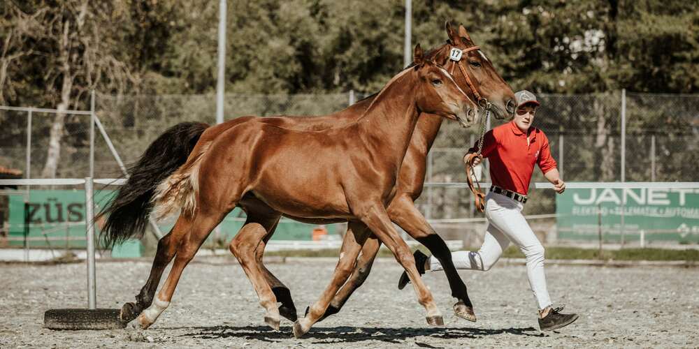 In Grüsch werden ab 10:00 Uhr 23 Fohlen mit Stute vorgeführt. Sie zeigen in einem ausgesteckten Dreieck auf dem Reitplatz ihre Gänge und den Trab, jedes Mal ein wunderschönes Bild und Erlebnis für die Zuschauer.