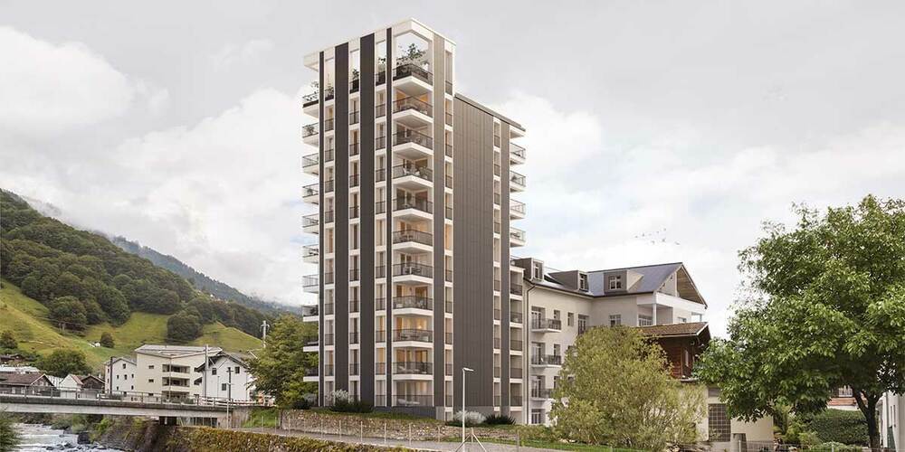 Für den Bauherrn, die Churer GUTGRÜN AG, beinhaltet die Nachhaltigkeit drei Dimensionen: eine ökologische, eine wirtschaftlich und eine soziale. Konkret heisst das: Wiederverwendung der Baustoffe nach dem Abbruch des alten Turms; kleiner ökologischer Fussabdruck der Baumaterialien; sparsamer Energieverbrauch beim Betrieb der Wohnungen; Bereitstellung von Kleinwohnungen, die in der Region dringend benötigt werden (sozialer Aspekt).