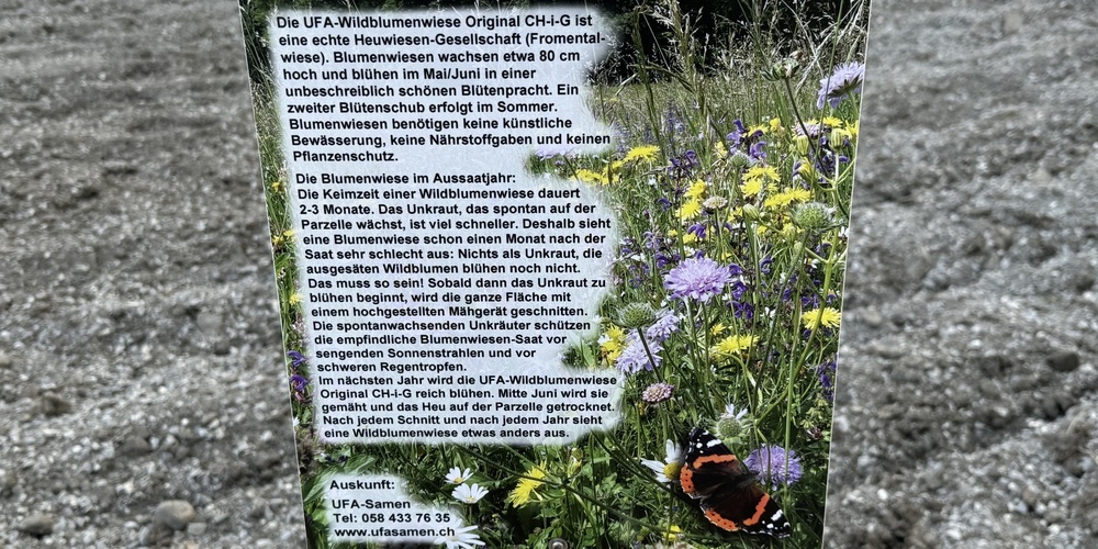 «Blumenwiesen wachsen etwa 80 cm hoch und blühen im Mai/Juni in einer unbeschreiblich schönen Blumenpracht. Ein zweiter Blütenschub erfolgt im Sommer. Blumenwiesen benötigen keine künstliche Bewässerung, keine Nährstoffgaben und keinen Pflanzenschutz.» So steht es auf den Tafeln rund um die Wiese beim Armenhausplatz, die für die Wildblumenwiese wirbt. Somit zeigt sich, dass der Boden, der aktuell eher noch wie ein frisch gepflügter Acker aussieht, bereits in wenigen Wochen Gestalt annehmen und ein starkes Ausrufezeichen für die Biodiversität setzten wird. Dies zudem noch mitten im Dorf und nicht irgendwo abgelegen, wo es kaum jemand entdeckt. Für diese Aktion, die sicher viele Kinderaugen zum Leuchten bringen wird, dürfen sich die Verantwortlichen der Gemeinde gerne ein «Sträusschen pflücken». Sie wissen nun ja wo.