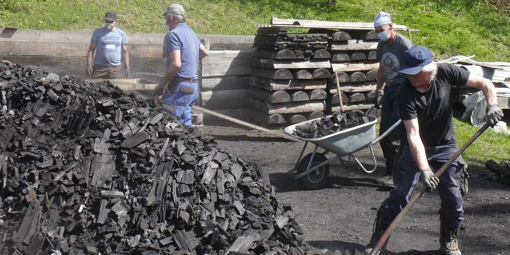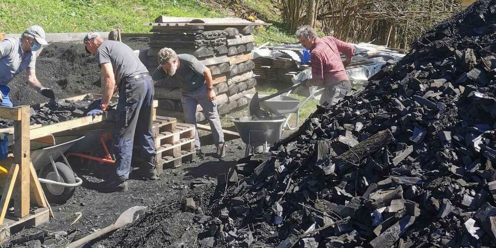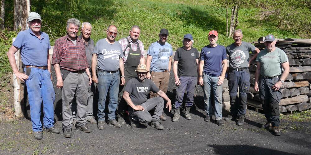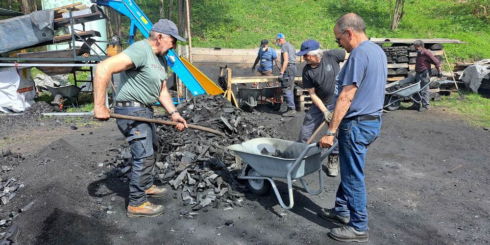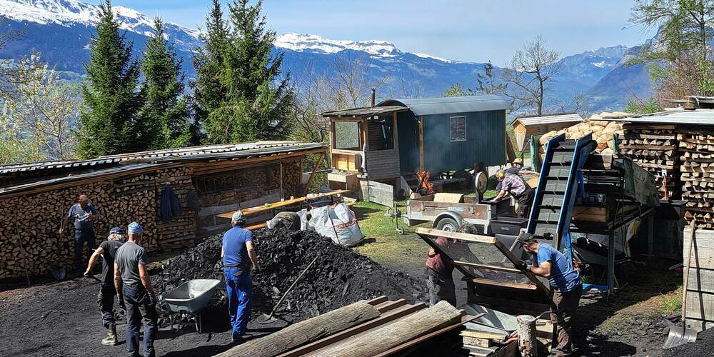 Bei strahlendem Sonnenschein war die Gruppe der Unentwegten vom Köhlerverein Malans dabei, die rund vier Tonnen Holzkohle zu ernten. Zufriedene, russverschmierte Gesichter – sie spotteten und meinten, sie seien halt alle nicht ganz sauber – schaufelten die Kohlestücke in die Schubkarren für die Aussortierung und das Abpacken in Säcke.