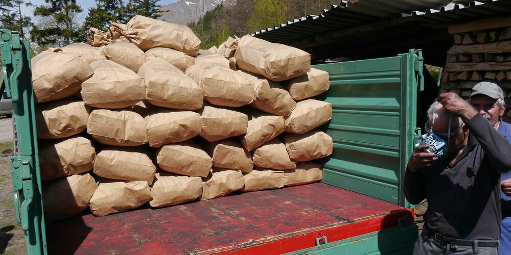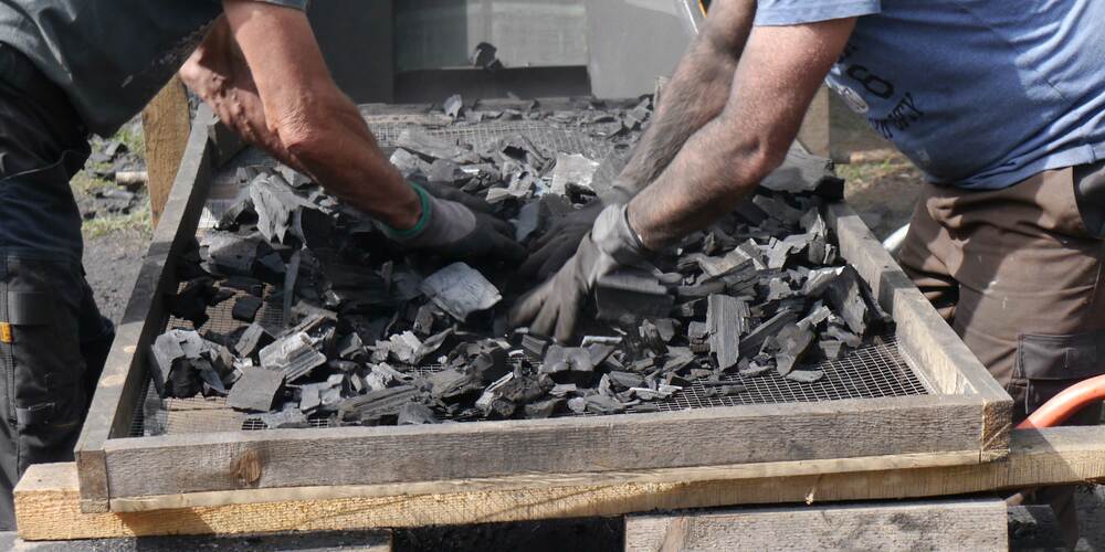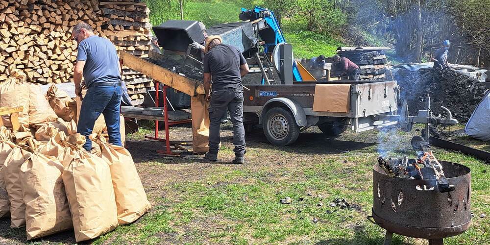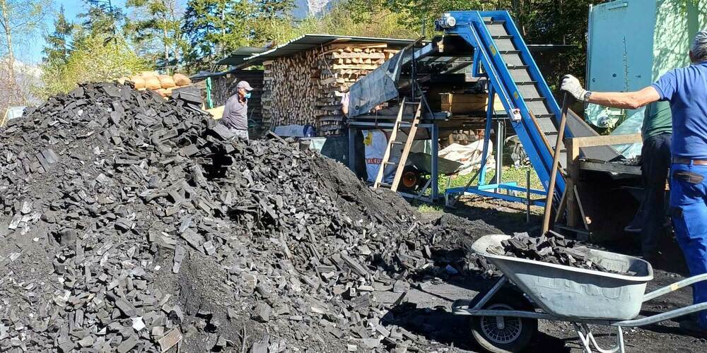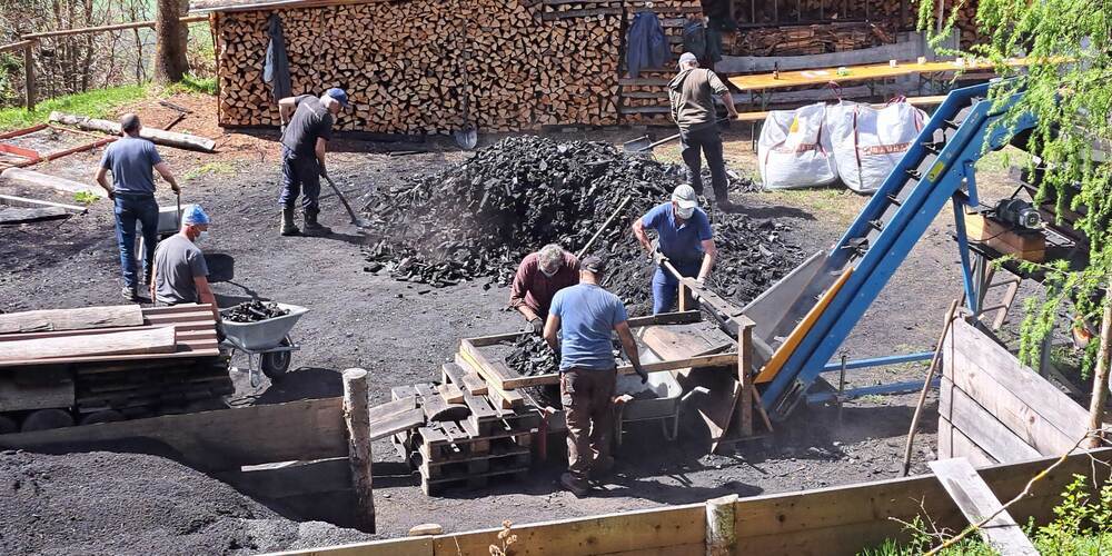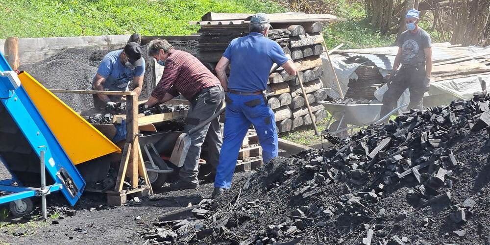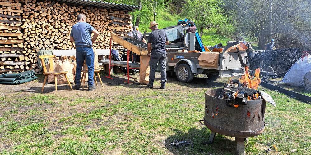Eifrige Hände waren gefragt und schon bald glänzten die ersten Schweissperlen auf der Stirn. Zusammen mit dem allgegenwärtigen Kohlestaub färbten sich die Gesichter zunehmend dunkel und strahlende Augen blitzten daraus hervor. Schubkarre um Schubkarre wurde zum Vorsortieren auf einem Sieb gerollt und vier fleissige Hände sorgten dafür, dass nur gut verkohlte Stücke auf das Förderband gelangten. Über ein Rüttelsieb kollerte die Holzkohle in eine Kiste, welche zur Waage getragen wurde. Acht Kilogramm sollen in einen Sack abgefüllt werden und der Präsident des Vereins persönlich sorgte mit einem Schieber dafür, dass das kostbare Gut auch im Sack landete. Mit einem Draht verschlossen, landeten die Säcke auf dem Anhänger und kurz nach Mittag wurde die erste Fuhre von 280 Säcken mit Bündner Holzkohle zum Forsthof hinunter gekarrt.