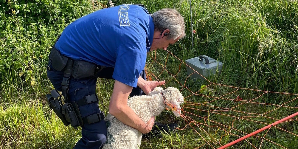 Aufmerksame Verkehrsteilnehmende meldeten sich kürzlich bei der Einsatzleitzentrale der Polizei, dass sich ein Lämmlein im Weidezaun verfangen habe. Das Lämmlein hatte grosses Glück, denn eine Polizeipatrouille war rechtzeitig vor Ort, um es zu befreien, wie die Kapo in den sozialen Medien schreibt.