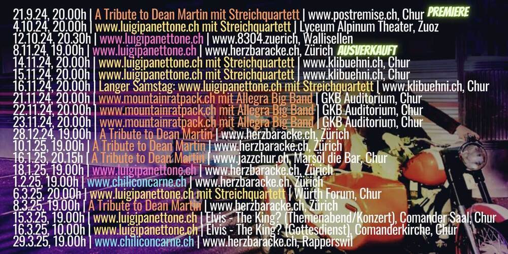 Zum Jubiläum und als Premiere präsentiert er am Samstag 21. Sept. um 20h in der Churer Postremise ein Panorama der schönsten Songs des grossen US-amerikanischen Entertainers Dean Martin. Mit seiner Kunstfigur Luigi Panettone interpretiert er seit Jahren Elvis- und nun auch Dean-Martin-Showprogramme mit Band und Streichquartett auf einem Niveau, das auch an Jazz Festivals für Begeisterung sorgt. Getragen von seiner langjährigen zauberhaften Band und verstärkt mit Streichquartett erklingen unsterbliche Songs wie „Buona sera“ oder „Memories are made of this“ und viele andere.