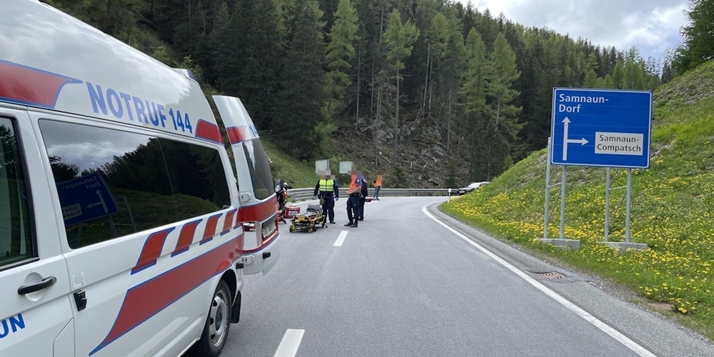 Ein 61-jähriger deutscher Lenker fuhr mit seinem Motorrad von Samnaun Dorf kommend, in Richtung Spiessermühle und Landesgrenze. In einer Linkskurve rutschte beim Motorrad unverhofft das Hinterrad nach rechts weg. In der Folge stürzte der Lenker auf die Fahrbahn und rutschte mitsamt dem Motorrad an den Fahrbahnrand, wo es zu einer heftigen Kollision mit der Leitplanke kam. Mit unbestimmten Verletzungen, wurde der Motorradlenker vorerst durch den Ambulanzstützpunkt Samnaun betreut und anschliessend durch die Rega ins Kantonsspital Graubünden nach Chur geflogen. Das stark beschädigte Motorrad wurde durch die Pikettgarage abgeschleppt. Ebenfalls waren Beamte des BAZG Grenzwache bei diesem Unfall im Einsatz. Der genaue Unfallhergang wird durch die Kantonspolizei Graubünden abgeklärt.