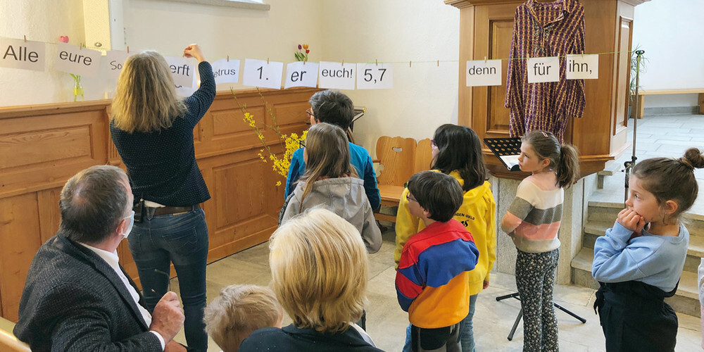 Die Sozialdiakonin ist von der Kirchenregion Prättigau angestellt für die Bereiche Kinder, Jugend und Familie. In Zukunft wird sie vermehrt regionale, moderne und kindergerechte Familiengottesdienste an verschiedenen Orten im Prättigau anbieten. In Jenaz durfte sie eine ganze Schar Kinder mit Eltern, Nanis und Nenis begrüssen. Sowohl Kinder als auch Erwachsene fühlten sich wohl im Gottesdienst – da wurde geklatscht und gehüpft, gerätselt, Verstecktes gesucht, mitgeholfen, oder auch nur zugeschaut.