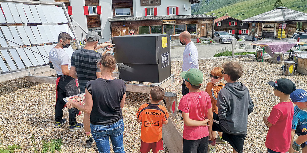 Eingebettet zwischen den Gipfeln liegt das Berghaus «Arflina», und davor steht ein riesiger Ofen mit lauter Spiegeln. «Das soll ein Ofen sein?», frage ich mich beim ersten Anblick. Doch nach kurzer Zeit wird sofort klar, wie einfach dieser Ofen funktioniert. Die Sonne scheint in die 29 Spiegel, diese wiederum lassen das Licht gebündelt in das Fenster des Ofens scheinen. Das Metall im Ofen heizt sich auf. Erstaunlich ist, dass sich die Sonnenenergie darin bis zu 600 Grad erhitzen kann. Mehr als genug, um eine Pizza zu backen.