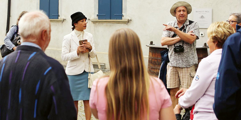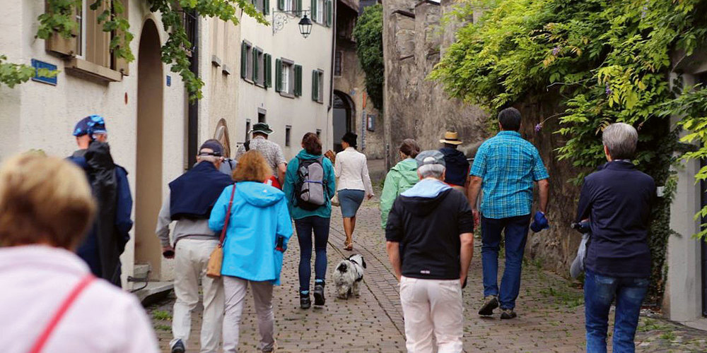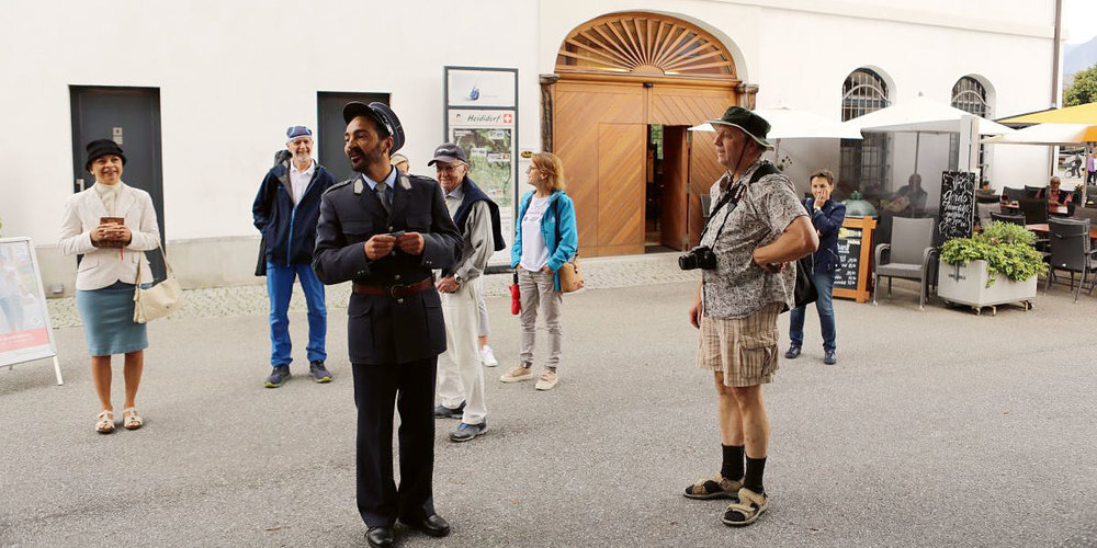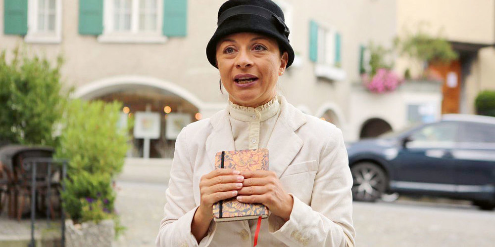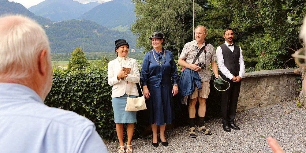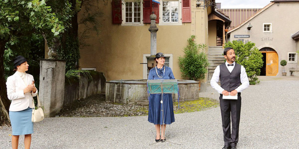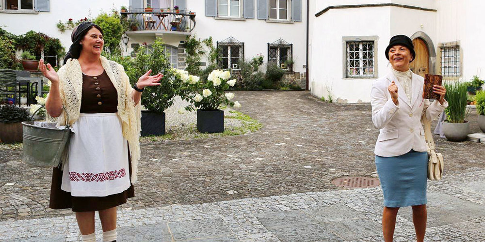 Auf dieser sehr informativen und kurzweiligen Stadtführung, tauchen Jung und Alt in die Geschichte rund um Maienfeld ein. So kommen nicht nur Touristen, sondern auch Einheimische voll und ganz auf ihre Kosten. Wer wissen möchte, wo sich früher das Spital befunden hat, weshalb die Mönche von Churwalden ihren Klostertorkel in Maienfeld hatten oder wo die Fähre nach Bad Ragaz ablegte, dem empfehle ich diese besondere szenische Stadtführung. Natürlich begegnen wir auf der Tour auch Heidi, der bekannten Romanfigur von Johanna Spyri, die bekanntlich in Maienfeld lebt. Dank der Erzählungen unserer kompetenten Stadtführerin wurden vor unserem inneren Auge historische Orte wieder sichtbar, an die heute nur noch der Strassen- oder Platznamen erinnern. Im Weingut Tanner treffen wir die Schauspieler bei einem Gläschen Wein noch zum Apéro und ich nutze die Gelegenheit für ein Gespräch mit Eliane Barth. Sie bestätigt meinen Eindruck, dass überwiegend Einheimische an der szenischen Stadtführung teilnehmen. Überrascht bin ich über ihre Antwort, dass gerade mal vier Schauspieler/innen neun unterschiedliche Charaktere spielen. Sie alle kommen aus verschiedenen Theatervereinen aus der Region. Unterstützt werden sie durch die Theatergruppe Jenins, deren Proberaum und Requisiten sie nutzen dürfen.
