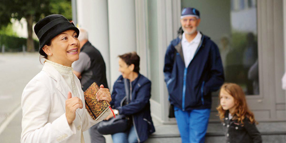 Pünktlich mit dem 10-Uhr-Glockenschlag stellt sich unsere Stadtführerin – gespielt von Eliane Barth – vor. Es kommt zu einem kleinen Disput zwischen ihr und dem eben vorgestellten Mann, der ihr immer wieder ins Wort fällt und unerlaubt Fotos macht. Ein zufällig vorbeikommender Wachmeister kann die Situation jedoch schnell auflösen und die Führung kann vorerst ungestört weitergehen.