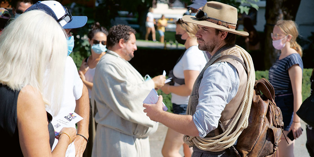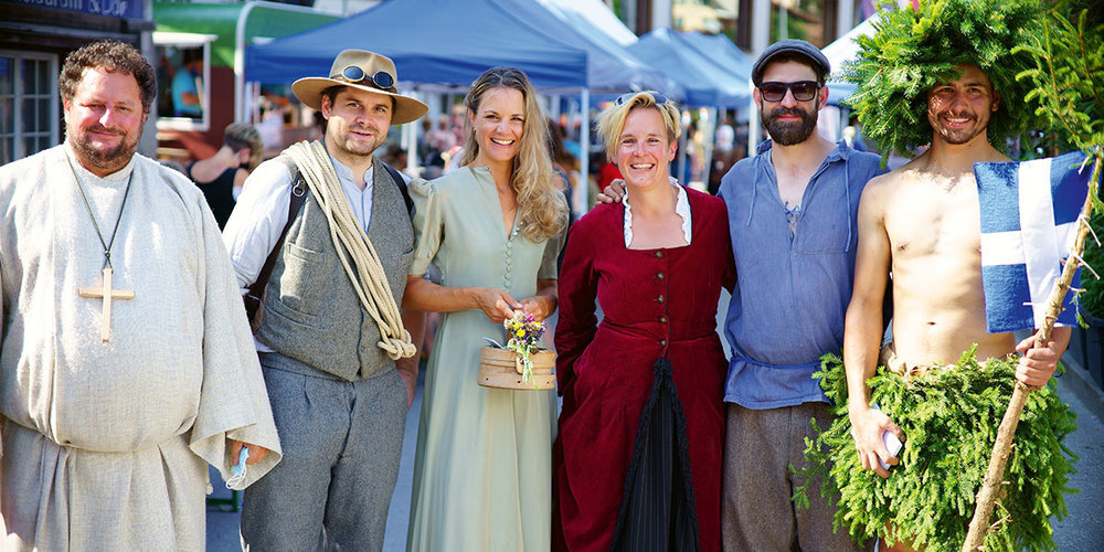einem erfolgsversprechenden Jahresprogramm rund um das grosse Jubiläum verwoben, wurden getrimmt und zu Jubiläumsjuwelen geschliffen. Seit letzter Woche können sie – fein säuberlich aufgereiht auf der eigenen Homepage www.klosters800.ch – erforscht und erkundet werden. Projektleiter Christoph Luzi freut sich: «Wir haben viel im Hintergrund ge-arbeitet, da freut es uns alle sehr, dass wir mit der Homepage einen ersten hübsch präsentierten Eindruck zum Grobprogramm zeigen können.» Als sichtbares Zeichen für den digitalen Auftritt flanierte vergangenen Samstag eine gutgelaunte Jubiläumstruppe passend gewandet durch die historische Genussmeile Klosters und machte mit Flyern auf die neue Homepage aufmerksam. Flankiert von Wildmandli (Jöri Grass) und Prämonstratenser-Mönch (Roman Burger) belieferte Projektleiter Luzi als historischer Bergführer und Kommunikationsverantwortliche Claudia Suter als Madrisafee die Gäste mit Flyer und charmanten Bildmotiven.